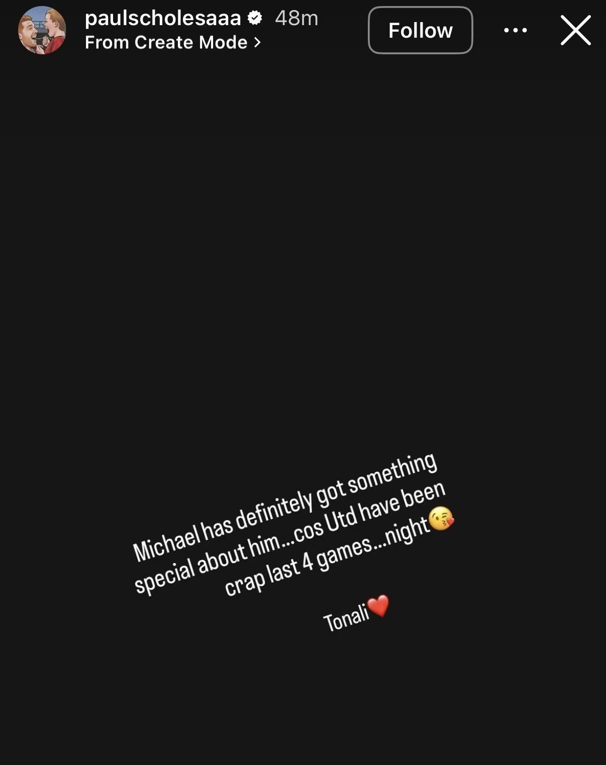 斯科尔斯在社交媒体发表动态,写道:“迈克尔(卡里克)身上肯定有某种特别之处,因为曼联最近四场比赛踢得简直烂透了……晚安托纳利❤️”